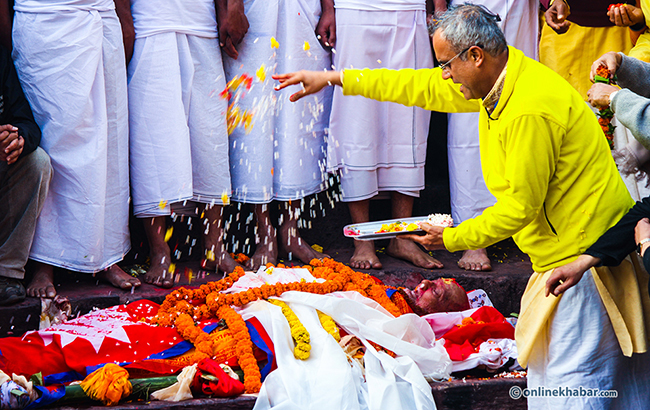 यस्तै प्रधानमन्त्री केपी शर्मा ओलीले कोइरालाको पार्थिव शरीरमा राष्ट्रिय झण्डा ओढाएका छन् ।